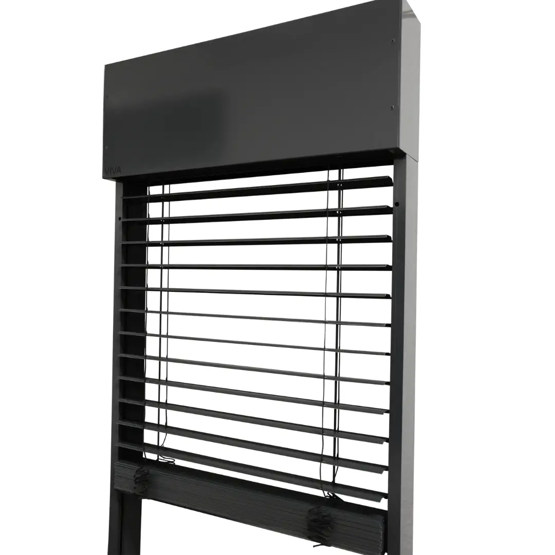 The basis of the self-supporting blinds are guide rails, on which the entire weight of the armour lies. The main representative of this special design of exterior blinds is the VIVA self-supporting blind. All types and sizes of slats can be used for this self-supporting blind, except for Cetta 50. An insect mesh can also be integrated into them. For the VIVA blind, the upper profile of the blind, including the entire package of slats, is placed in an pre-assembled box, which has an angular design. Its box can be made in two variants – under-plaster or recognized. The under plaster variant means that the box is "hidden" under facade and when the blind is fully retracted into the box, this blind is not visible at all. This variant of design must be taken into account already during the implementation of the construction project. In the under-plaster version, the VIVA blind box can be provided with 10 mm thick hardened polystyrene from the front and back at the same time. The box is visible for the recognized variant.