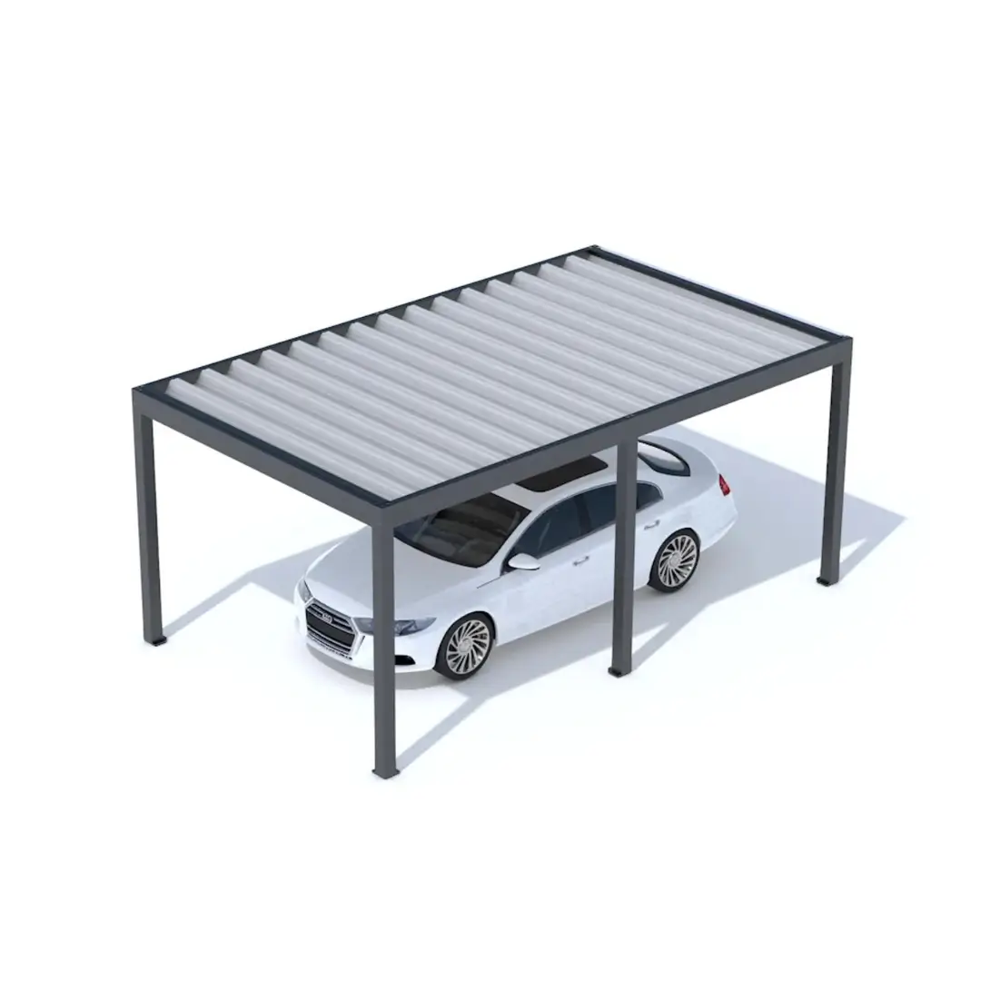 The Carport ARTOSI is a timeless shelter with an innovative design, developed with emphasis on precision, quality of workmanship and possibility of individual modifications, which will ensure the protection of your car against the adverse effects of the weather. The aluminium construction, which is identical to the construction of the ARTOSI bioclimatic pergola, is supplemented with a load-bearing plate (RAL 9006) or polycarbonate. The ARTOSI shelter roof has integrated water drainage inside the construction with no need for further modifications, with optional LED lighting located around the entire perimeter, controlled by a motion sensor or using IO technology. The shelter can also be delivered in a roofless version (only stands and perimeter frame). The shelter roof is manufactured with high precision and installation is therefore easy and fast. You can choose a free-standing or wall-anchored design. We offer ARTOSI shelter roof in twelve basic construction colours identical to the standard colours of the ARTOSI pergola, where the roof can be made of galvanized trapezoidal plate or polycarbonate in three colours. The maximum load capacity is 150 kg/m2, we guarantee wind resistance up to 120 km/h and water drainage of 50 l/m2h. The standard warranty is 5 years for construction, 2 years for LED lighting.